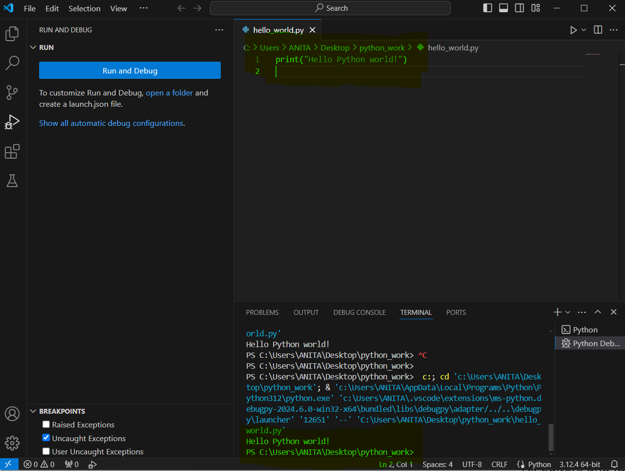 PS C:\Users\ANITA\Desktop\python_work> c:; cd 'c:\Users\ANITA\Desktop\python_work'; & 'c:\Users\ANITA\AppData\Local\Programs\Python\Python312\python.exe' 'c:\Users\ANITA\.vscode\extensions\ms-python.debugpy-2024.6.0-win32-x64\bundled\libs\debugpy\adapter/../..\debugpy\launcher' '12795' '--' 'c:\Users\ANITA\Desktop\python_work\hello_world.py'
